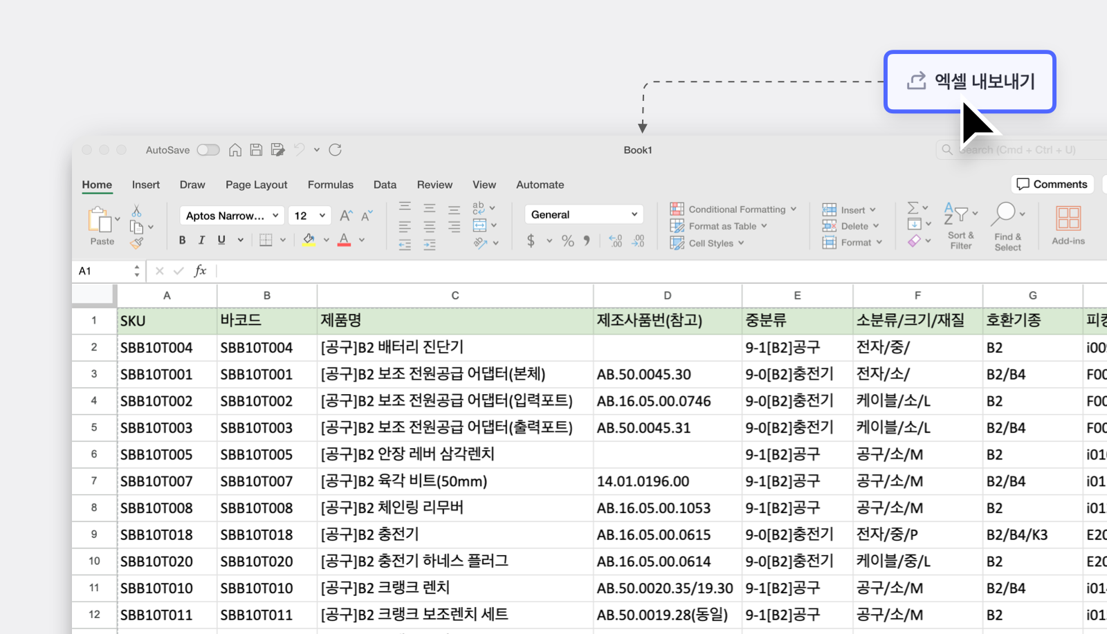 이렇게 세팅한 SKU 번호는 현재 박스히어로와 ERP 시스템을 연동하는 데에도 활용되고 있어요. 지바이크 재무팀이 회계 업무를 위해 사용하는 더존 ERP에 엑셀 파일로 내려받은 박스히어로 데이터를 업로드하는 방식인데요. SKU 번호가 양쪽 시스템에 동일하게 설정되어 있어, 데이터를 가공할 필요 없이 부품의 재고 정보를 간편하게 동기화할 수 있어요. 별도의 개발 투자 비용을 투자하지 않아도 물류팀의 재고 솔루션과 재무팀의 ERP 간의 데이터 통합이 가능한 거예요.