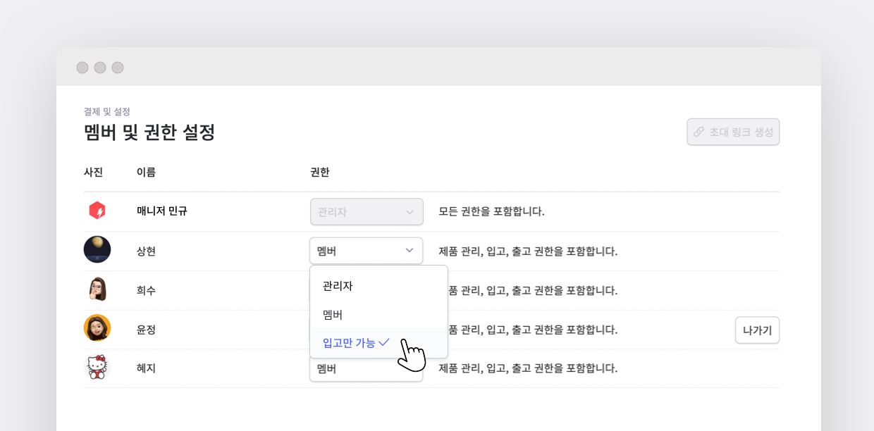 예를 들어 제품 입출고 권한이 필요한 직원이 있을 것이고 단순히 재고 확인만 필요한 직원이 있겠죠. 이 두 직원의 권한을 다르게 설정해 주시면 돼요. 특히 직원 수가 많은 병의원이라면 더 유용하게 사용하실 수 있을 거예요. 직접 기능 권한을 커스터마이징해서 권한 설정할 수도 있어요!