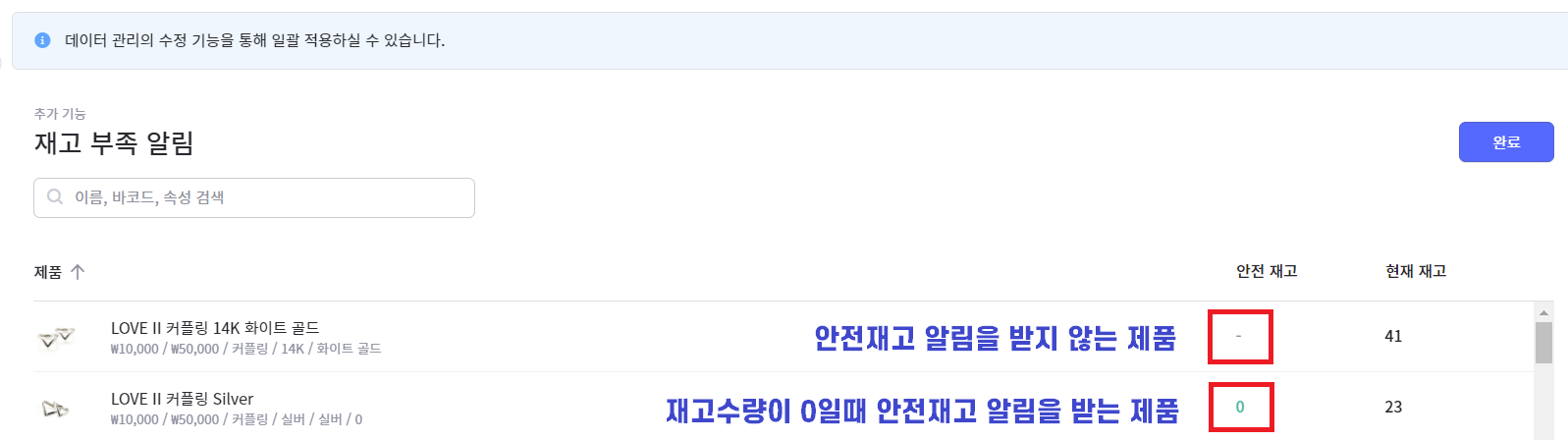 재고 부족 알림에서 안전 재고 수량은 1부터 설정이 가능해, 재고량이 0인 경우 알림이 필요한 고객분들은 사용에 어려움이 있었습니다.